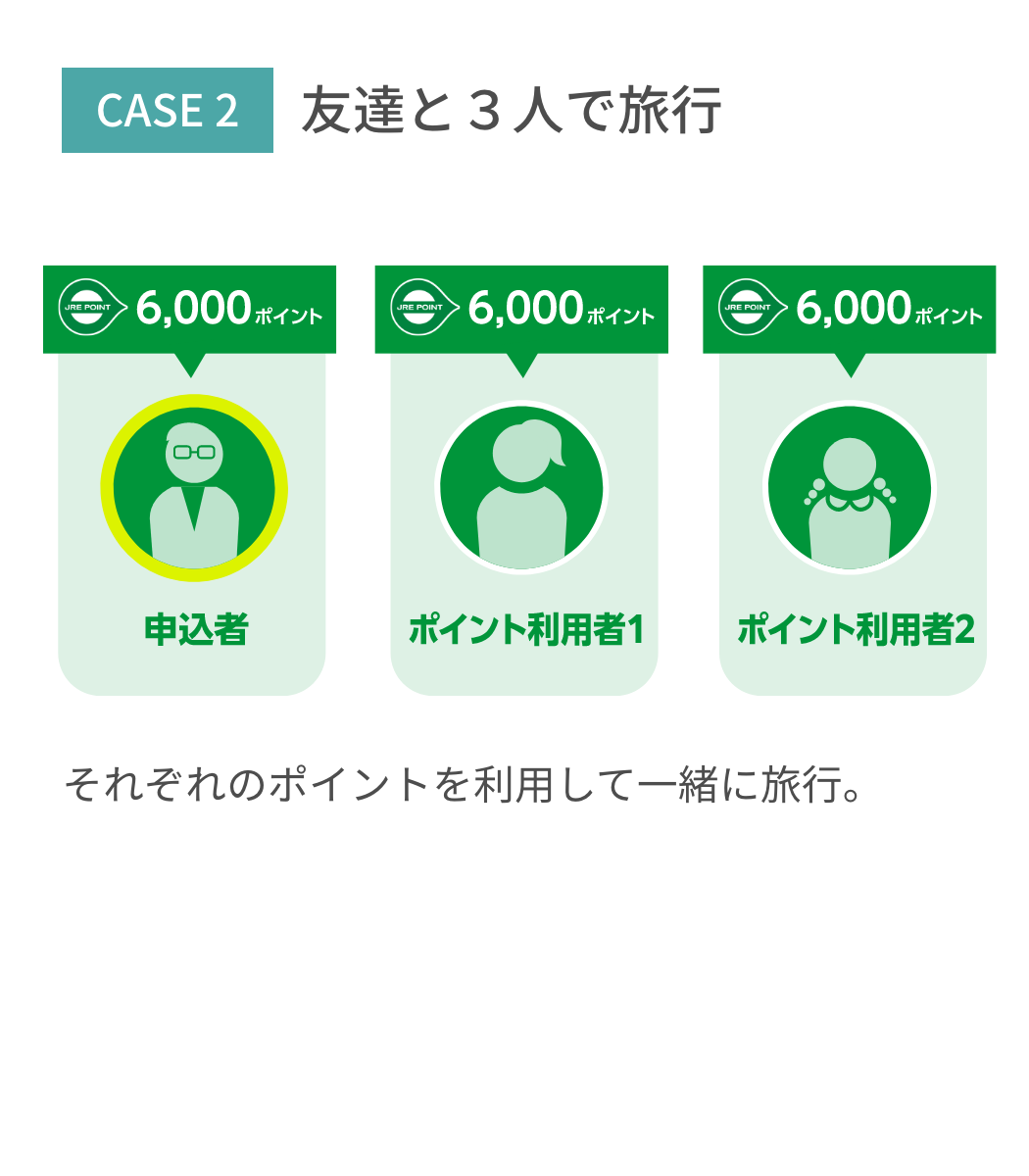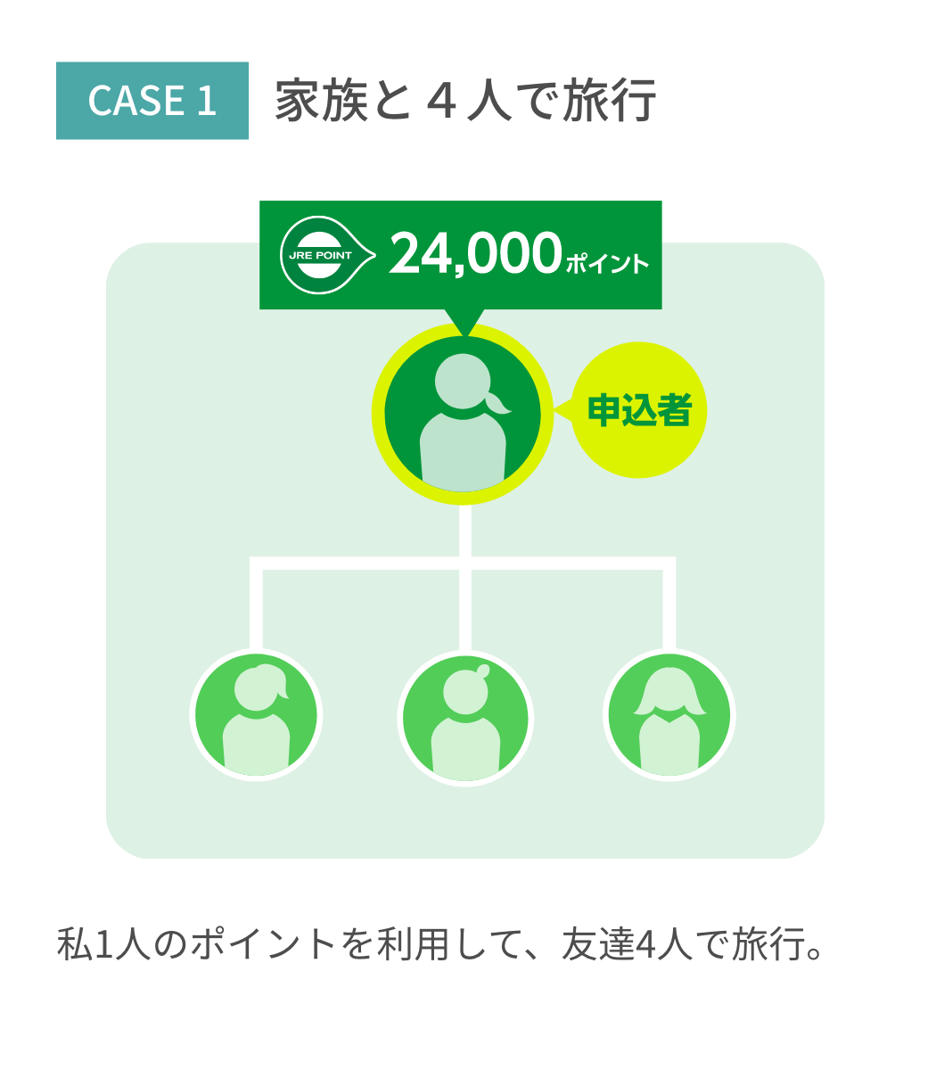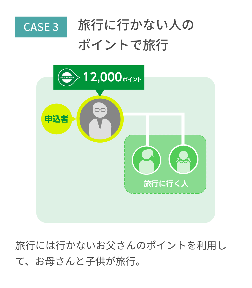 旅を申込む「申込者」、ポイントを利用する「ポイント利用者」、実際に旅をする「旅行者」を自由に組み合わせることが可能です。